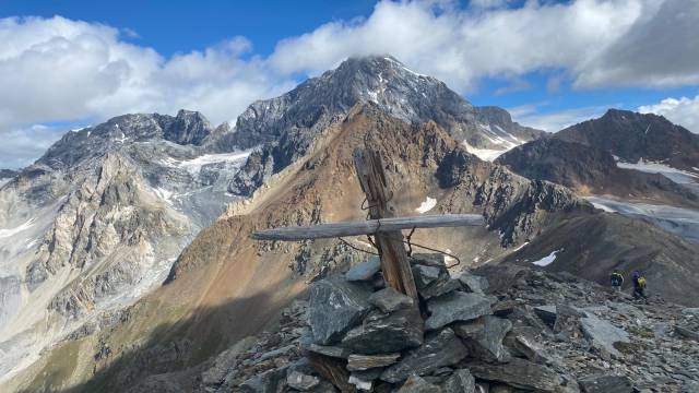 Rifugio Pizzini con segnaletica. Visitato il Villaggio raggiungiamo la cima Zebru' e i passi Zebru'