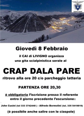 Ricordiamo che per poter partecipare alle gite serali e alle uscite di scialpinismo è obbligatoria l'iscrizione presso il referente entro il giorno precedente l'escursione. Per maggiori informazioni sull'attrezzatura necessaria contattare sempre il relativo referente.